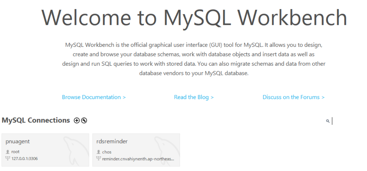 MySQLWorkBench를 실행하고 메인에 있는 + 를 눌러서 추가할 준비를 하자